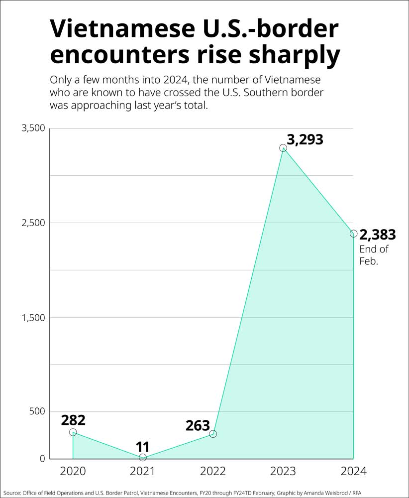 Just 263 Vietnamese crossed into the United States via its border with Mexico between October 2021 and October 2022, but nearly 3,300 made that crossing a year later, according to figures from the U.S. Customs and Border Protection, or CBP. That number is certain to be surpassed in 2024. From last October to this March, nearly 2,400 have already crossed.