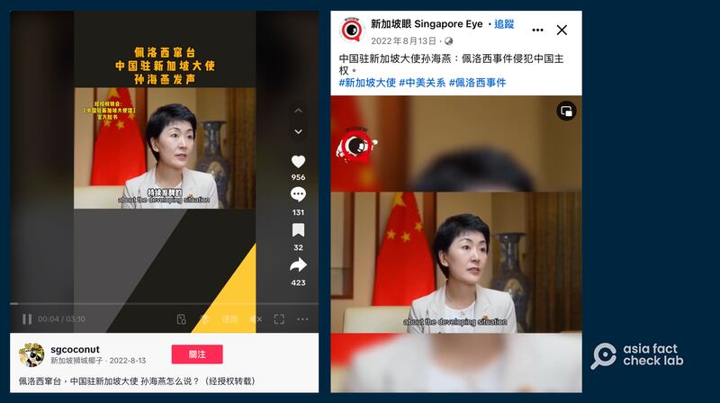 《新加坡眼》和《新加坡狮城椰子》宣传孙海燕对佩洛西访台的立场。 (取自tiktok、脸书)