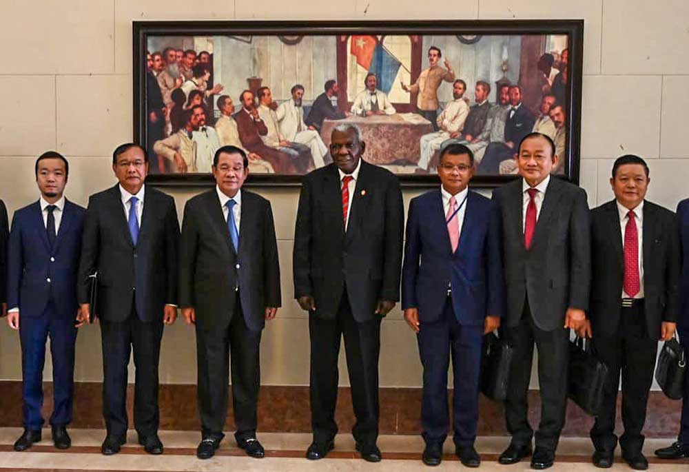 2022年9月24日,商人陈志(左一)、柬埔寨时任总理洪森(左三)、古巴国民议会主席埃斯特万·拉索·埃尔南德斯(左四)站在一起。陈现在拥有古巴国家雪茄公司四分之一的股份。(古巴国民议会)