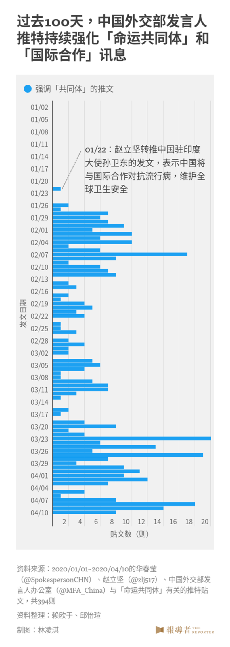 我们搜集中国外交部发言人华春莹(@SpokespersonCHN)、中国外交部发言人赵立坚(@zlj517)、中国外交部发言人办公室(@MFA_China)3个账号于2020年1月1日至4月10日在推特的发文数据,共计4,574笔,试图从中解析中国政府如何在社群媒体上谈论COVID-19疫情,透过中国的外交发言系统与发言人的发言频率、论述内容,来了解中国对外舆论塑造出的形象。